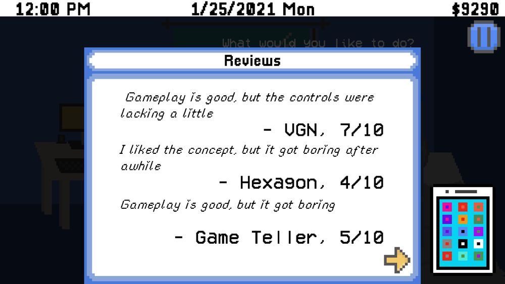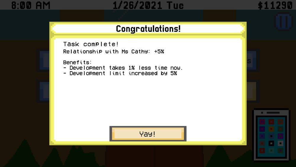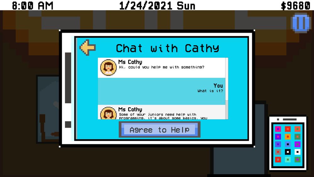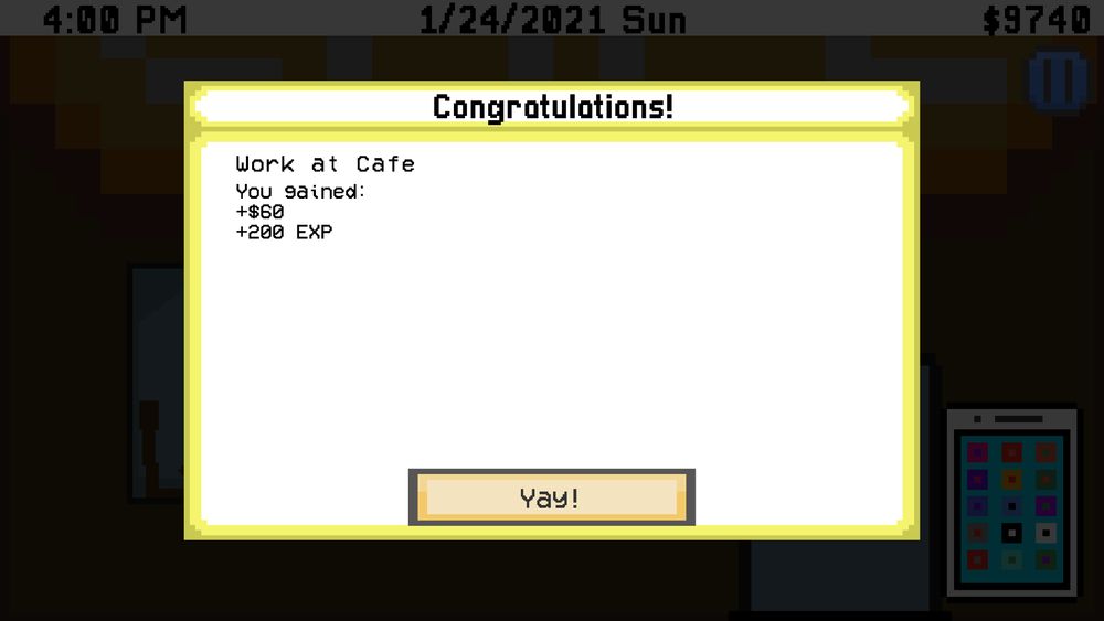 The game features a Life Simulation + Game Dev Simulation cycle. Similar to Persona 5, this means that the player is incentivised to complete life simulation tasks, like keeping up with their Friends, helping their Teachers, and working in the Cafe to earn money, buying gifts etc. These actively help them gain experience, money and even extra help with game development.