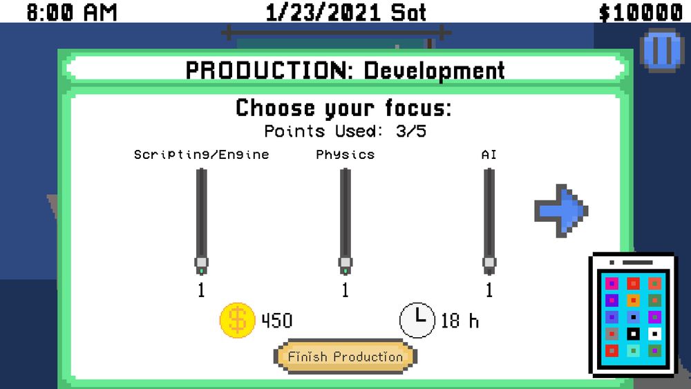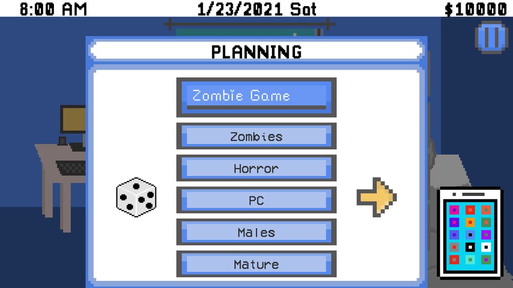 In the Game Dev Simulation, players have to pick a suitable genres and target demographics to ensure sucess of their games that are published. This is inspired by Game Dev Tycoon. The beginning experience you have is not a lot, but you can gain insight and extra points to place into the game